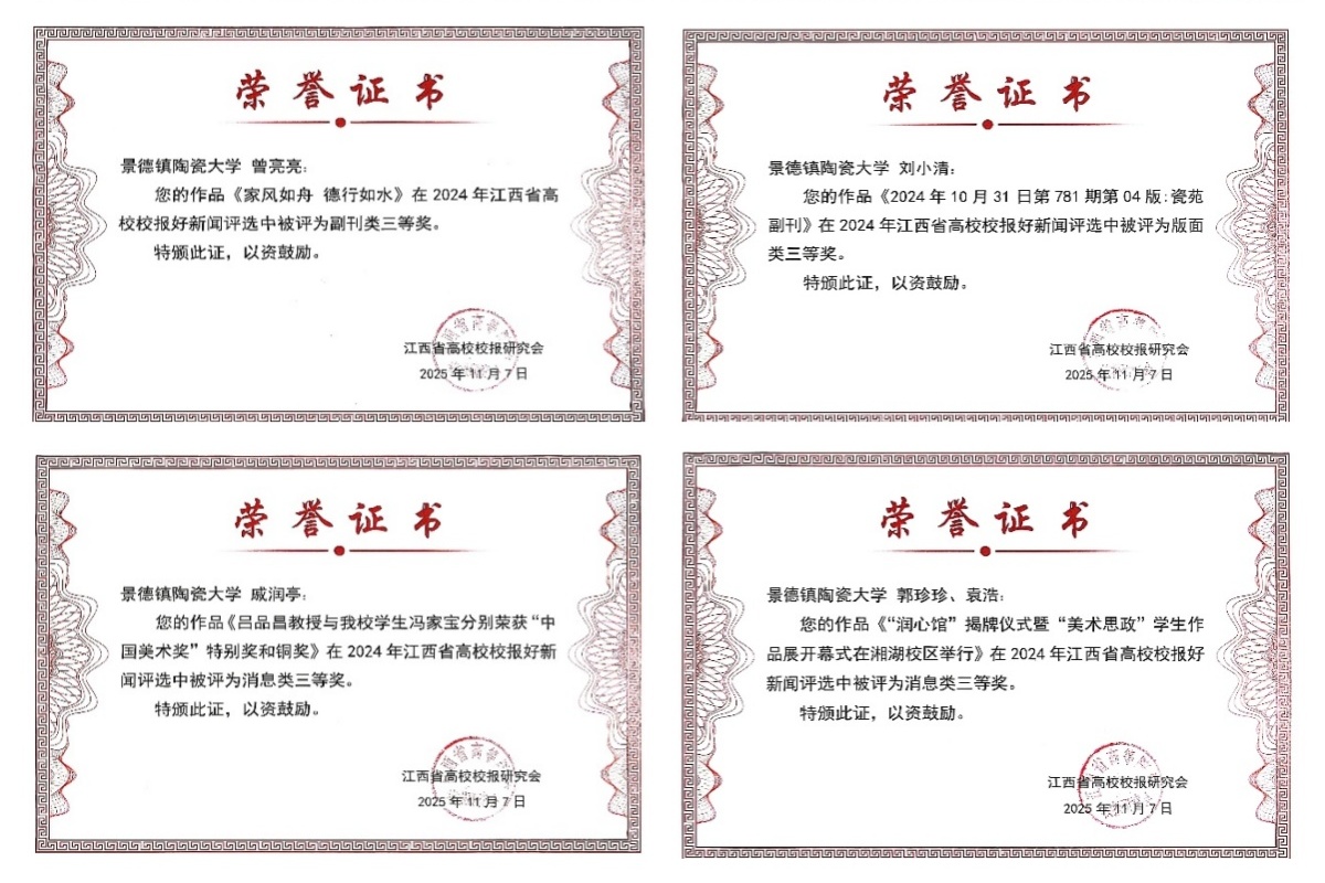 其中,我校选送的新闻作品《景德镇国际陶瓷艺术双年展优秀作品巡展在南昌开幕》(作者:计颖、兰茜)获新闻摄影类一等奖,《忠厚诗书联》(作者:何璐璐)获副刊类一等奖;《中国共产党景德镇陶瓷大学第二次党员代表大会隆重召开》(作者:计颖、刘小清)获消息类二等奖,《一个人的学位授予仪式》(作者:朱若檬、陈朗)获通讯类二等奖,《我校团队设计的北京大兴机场“景德镇制·瓷园”项目盛大开园》(作者:曹上秋)获融合报道类二等奖;《一个人的学位授予仪式》(作者:朱若檬、陈朗)获新闻摄影类三等奖,《家风如舟 德行如水》(作者:曾亮亮)获副刊类三等奖,《吕品昌教授与我校学生冯家宝分别荣获“中国美术奖”特别奖和铜奖》(作者:戚润亭)获消息类三等奖,《“润心馆”揭牌仪式暨“美术思政”学生作品展开幕式在湘湖校区举行》(作者:郭珍珍、袁浩)获消息类三等奖,《2024年10月31日第781期第04版:瓷苑副刊》(作者:刘小清)获版面类三等奖。
