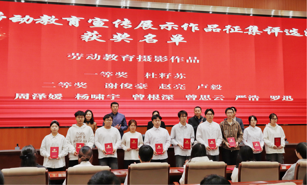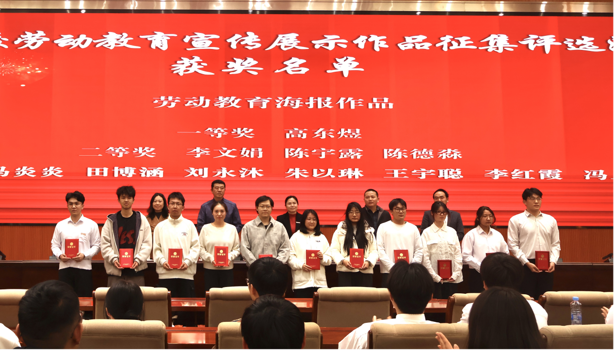 仪式上,学校为2025年校劳动教育宣传展示作品征集评选活动获奖师生颁奖,表彰在劳动清单、劳动教育海报、劳动教育摄影创作中的优秀成果。党委学生工作部(党委研究生工作部、学生工作处)劳动教育教研室教师高东煜结合劳动教育教学实践,阐释了劳动教育知行合一的内涵。设计艺术学院2024级艺术设计专业杜籽苏结合自身的志愿服务经历与获奖作品,分享了对劳动的真切体悟。