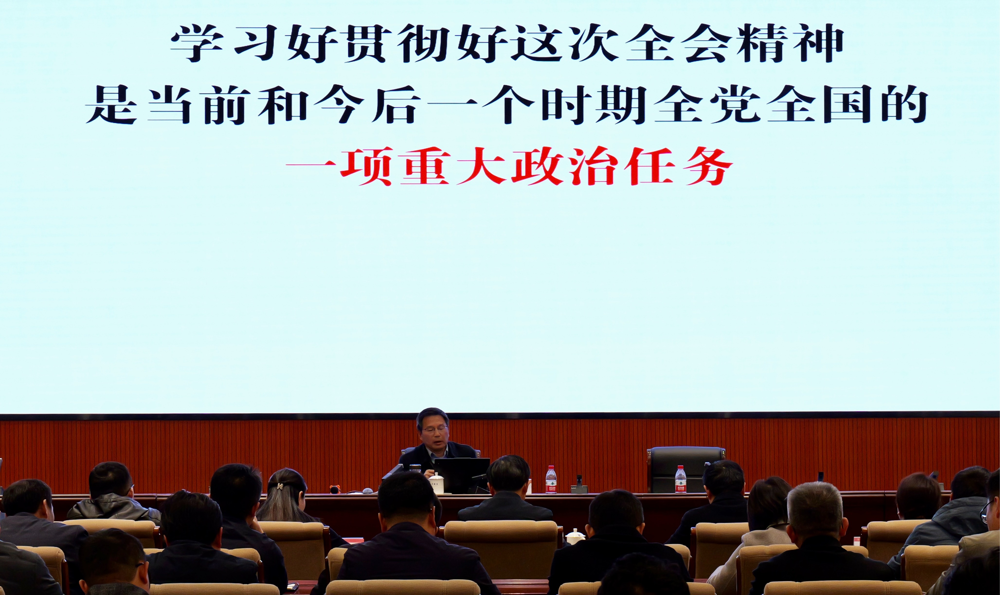 本网讯(党委宣传部)根据学校党委统一安排,12月1日,校党委常委、党委宣传部部长曾德生为机关党员干部宣讲党的二十届四中全会精神。校党委常委、党委组织部部长杨志民,机关党委班子成员、纪委班子成员,机关各党支部班子成员,以及机关全体处级、科级干部参会。会议由机关党委书记、党校副校长陈涛主持。